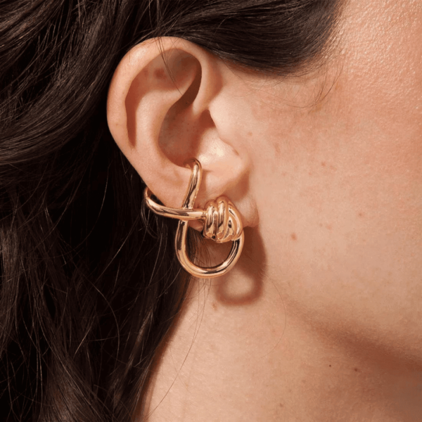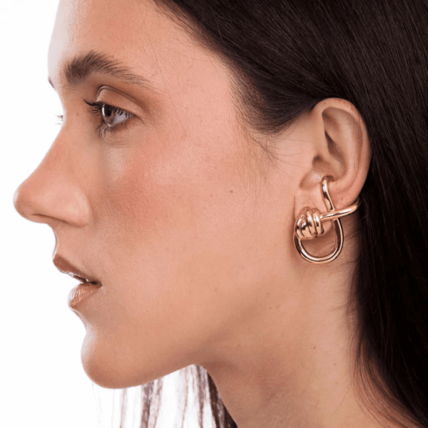 Assim como o Brinco Algarve, concebido em uma Collab Maria Dolores e a estilista Patricia Bonaldi, a PatBO. Um brinco médio, somente em metal, no ouro ou ródio negro, leve, mas com uma potência de presença. Com um design que encaixa na orelha de diversas formas, o brinco tem a sua textura e detalhes no metal que remetem aos nós e cordas de um barco e preenche bem o lóbulo.