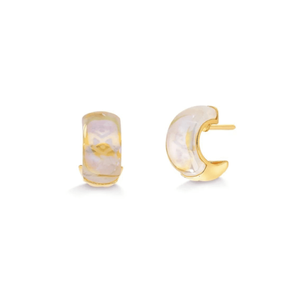 Um brinco pequeno, em formato de argola larga, folheado a ouro ou ródio negro, com a pedra Quartzo Azul Anil com lapidação cabochão, que integra e preenche a argola com uma curvatura e espessura. Na parte inferior da argola, onde é em metal, o design de uma almofadinha com detalhes de textura como as dobraduras no tecido. O design do brinco foi elaborado com o cuidado de soldar o pino mais para baixo, para a argola subir e envolver o lóbulo da orelha, para um efeito ainda mais bonito. Um brinco atemporal, que sempre vai estar na moda, perfeito para compor com charme e elegância o styling, criando um ponto de cor com muita sofisticação.