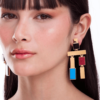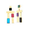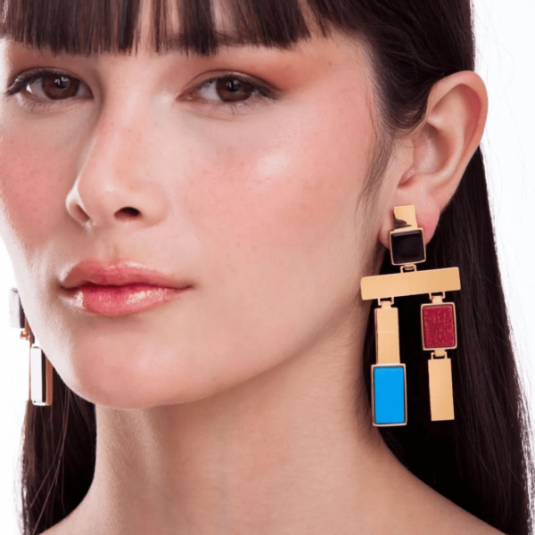 Assim como o Brinco Ladrilhos Maria Dolores, brinco statement da coleção, com elementos geométricos em uma peça leve e confortável. O brinco possui design assimétrico, em que os seus lados não são iguais, com os blocos posicionados diferentemente. A peça é composta por uma base de blocos quadrados, sendo uma em Obsidiana Preta e a outra em Malaquita, que veste o lóbulo da orelha. Abaixo, uma barrinha formada por uma chapa de metal cortada a laser e que tem toda uma imponência com dois pendentes, também formado por blocos em Feldspato Vermelho, Haulita Roxa Listrada e Turquesa, Obsidiana Preta e metal.