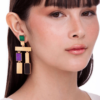 Um brinco que é o protagonista do look, mas muito leve, com movimento e detalhes que trazem uma alegria para a peça com as pedras coloridas, uma maneira de ousar que é muito característico da marca Maria Dolores.
