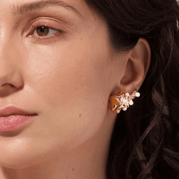 Uma peça versátil, que pode ser usada de diversas maneiras, seja colocada mais para cima, ou na diagonal, para acompanhar o lóbulo e vestir a orelha com brilho, texturas e um perfume do mar.