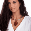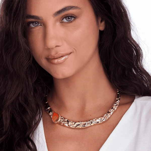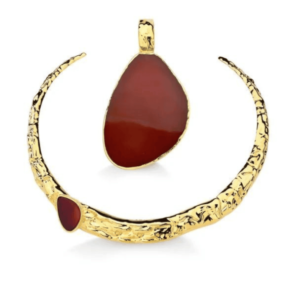 Um colar versátil, folheado a ouro ou ródio negro, composto por elementos que são uma releitura da coleção Alma e que pode ser usado de duas formas. A choker é formada por uma estrutura de metal com textura mais bruta e uma pedra Ágata Vermelha com formato orgânico incrustada no aro. Destaque para o pingente removível, composto por uma imponente chapa de Ágata Vermelha, emoldurada por metal. Uma choker 2 em 1, já que pode ser usada com ou sem o pingente, criando duas propostas diferentes ao seu styling.